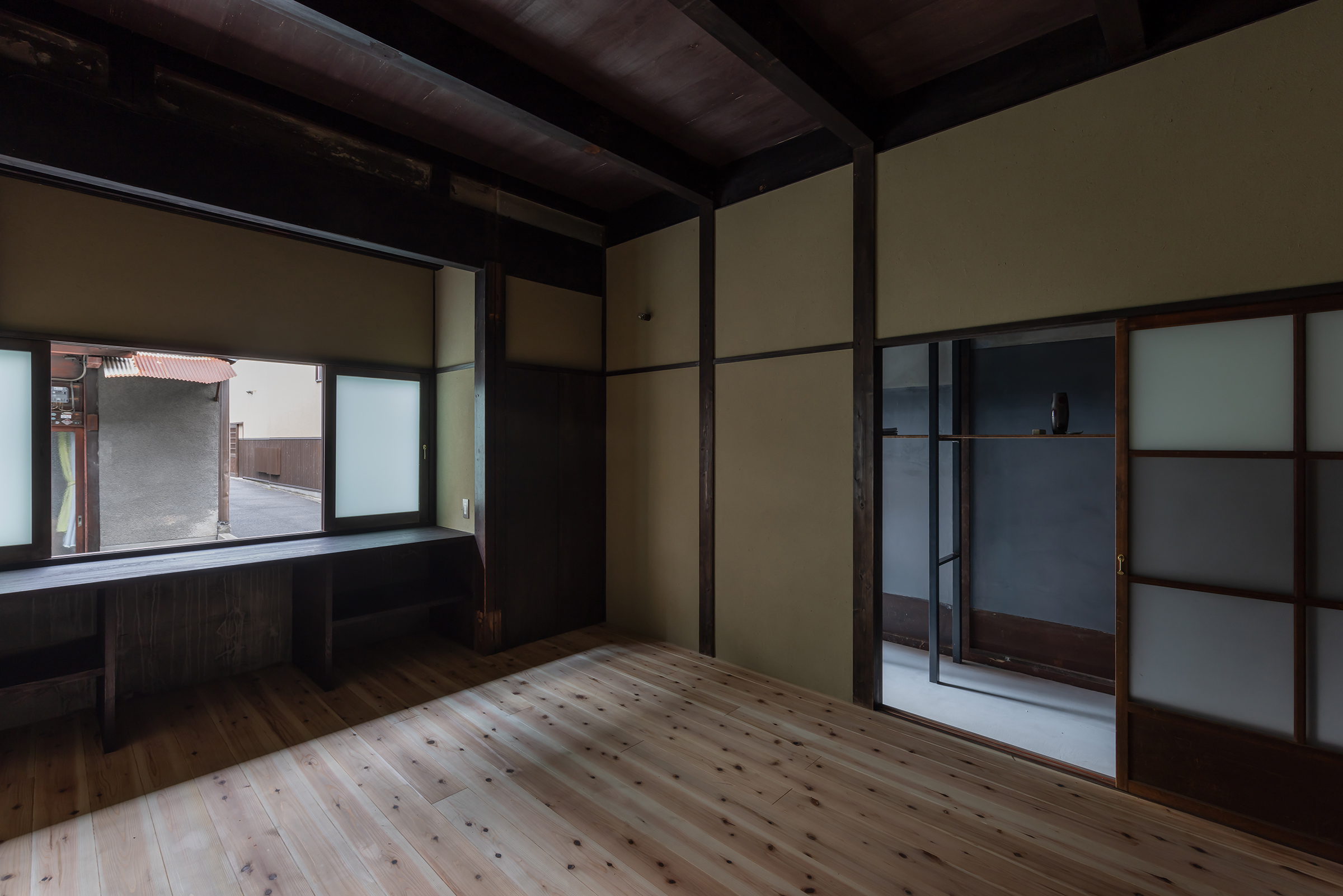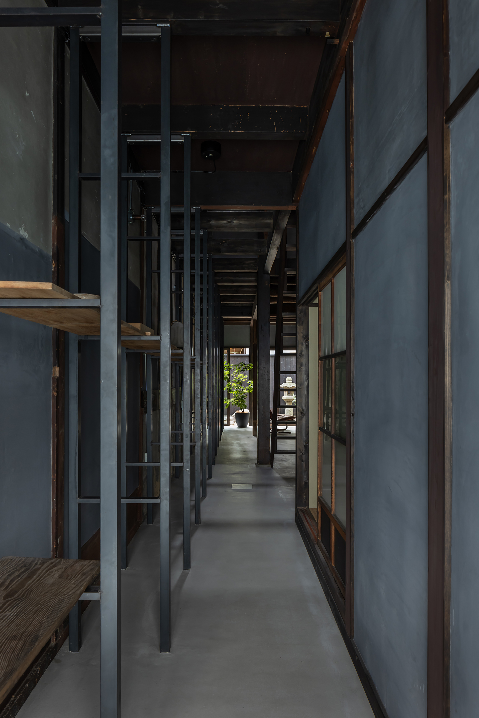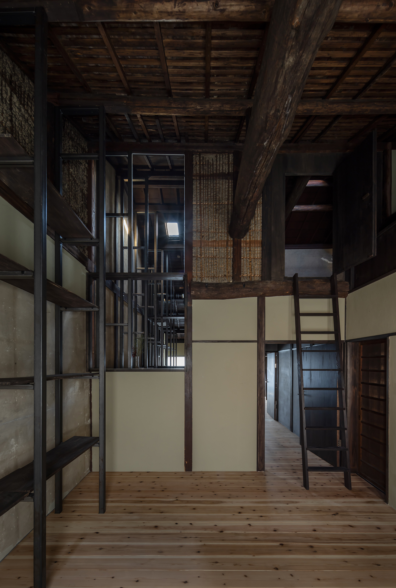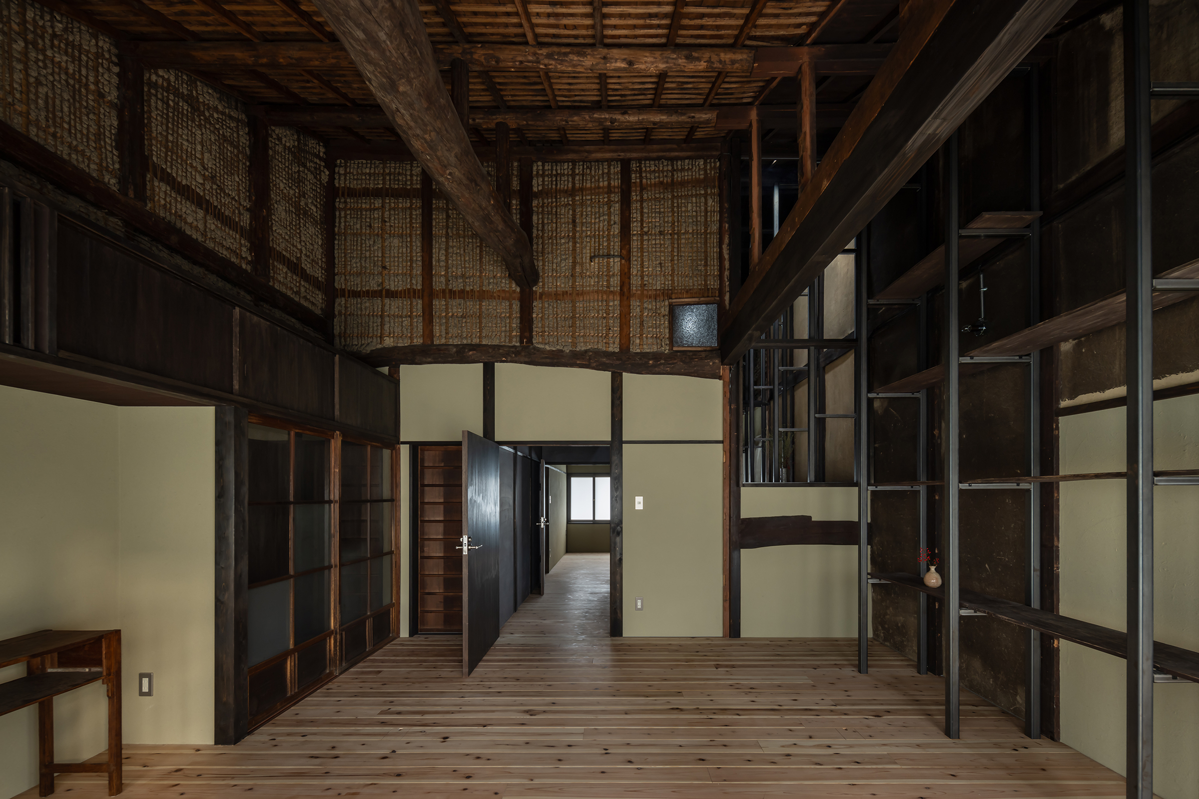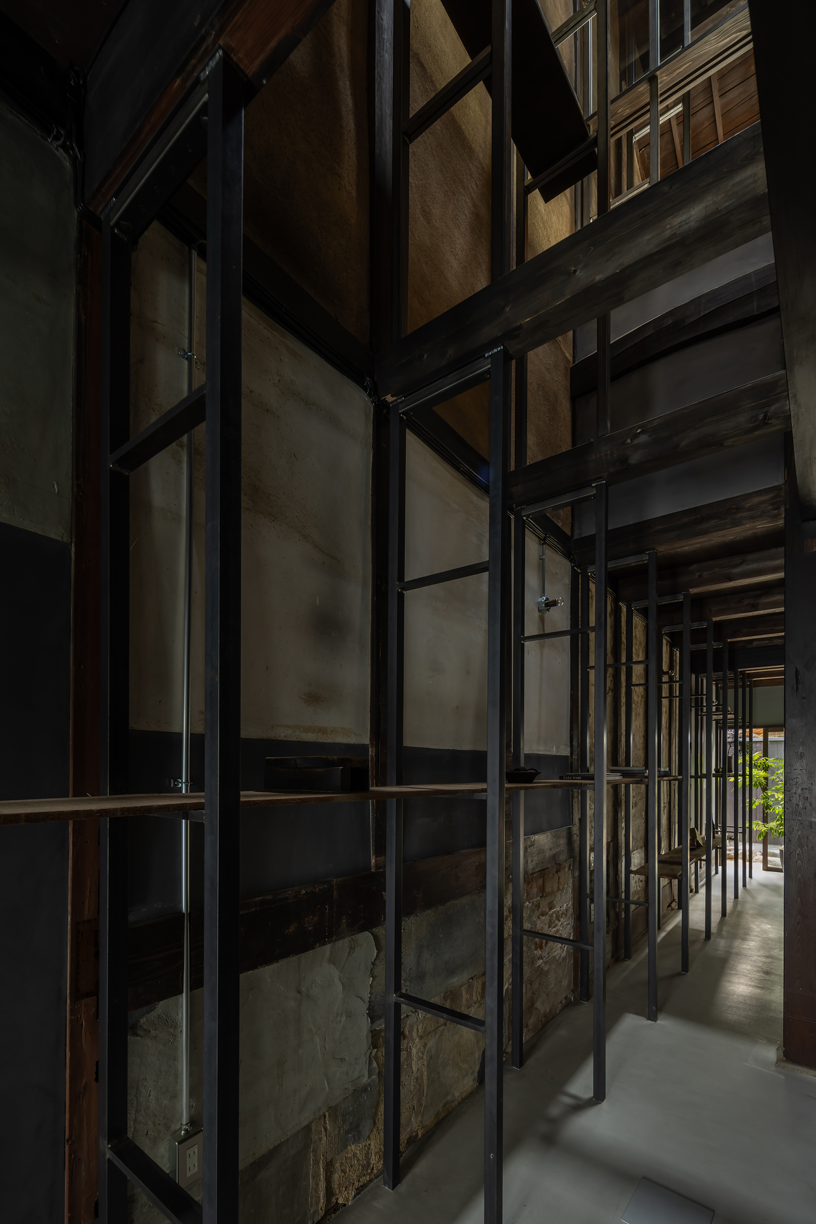 京都市中京区越後町に位置する町家を改修し、海外在住の芸術家の拠点とするためのプロジェクト。敷地は六角通に面しており、堀川通と油小路通の間の多くの路地や小路に囲まれた地区にある。通りにではなく路地に面した家も多いなか、偶然にもこの家の通り庭は六角通り向かいの細い路地の延長線上に位置していた。そこで、この計画では、通り庭を分散していた既存の間仕切り壁を撤去し北側の通りから奥庭までの動線を一直線に繋ぎ、光と風が抜ける通り土間とした。奥の庭は作業場へと続き、東隣の路地と鉄扉で繋がる。これらの周辺環境のみちの空間体験を建築内部にも引き込むことで「町」と「家」の境界のようなものを取り除こうと考えた。 「町」の中に「家」があるのではなく、「家」の中でも「町」の存在や空気を感じることができるようなことを意識した。通り庭沿いに設けられた鉄製の梯子状フレームは、間仕切り壁を撤去した既存の木造に対しての水平耐力を補う柔らかい構造補強として屋根まで達している。 この梯子状フレームに既存の床板などの古材を自由に配置することで違い棚として使うことを提案した。棚として使ったり、町から探してきたものをここに置き飾ったり、日々の生活が滲み出ることで周辺のみちと一続きとなった路地奥のような「町」と「家」が混じりあった空間となることを願っている。