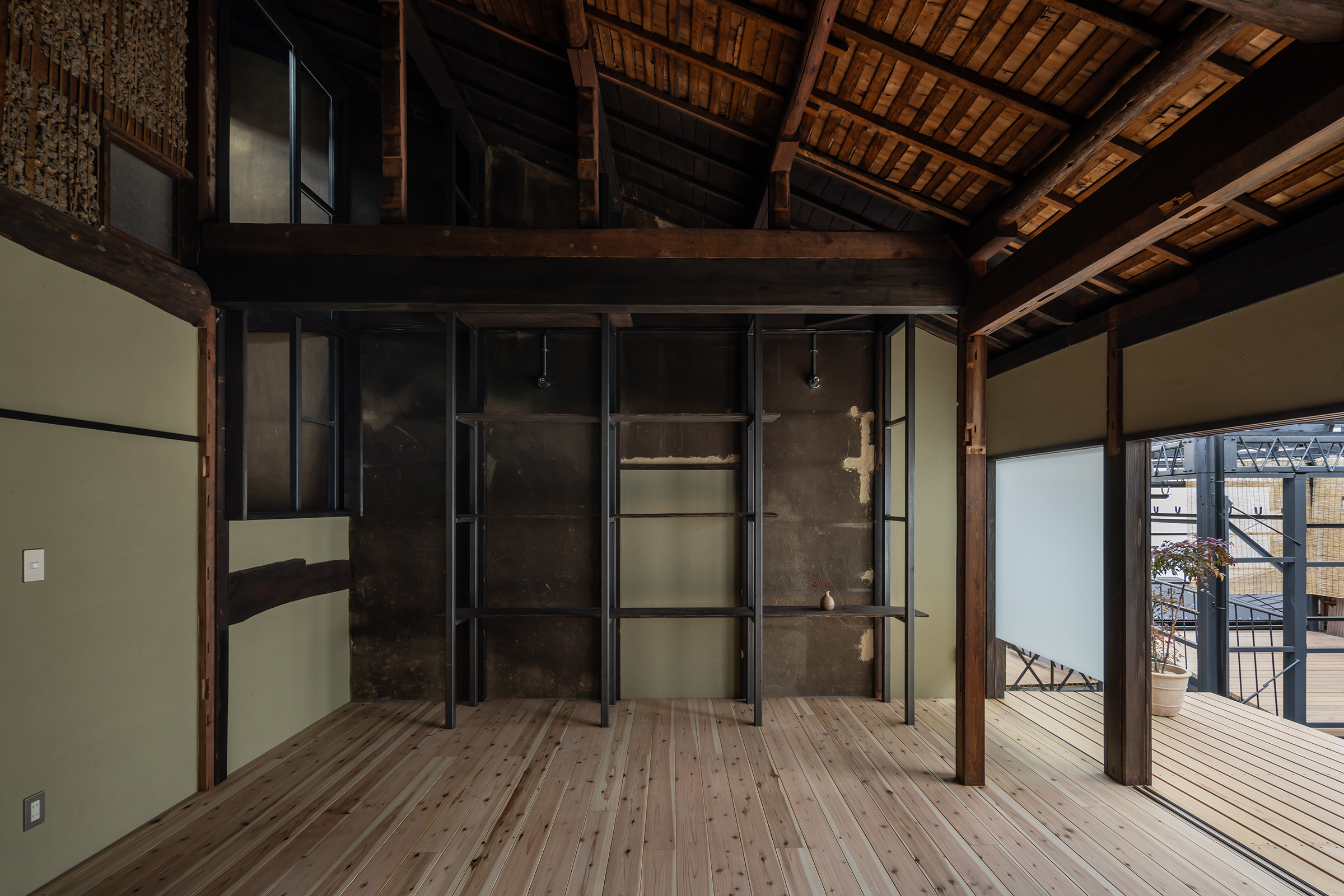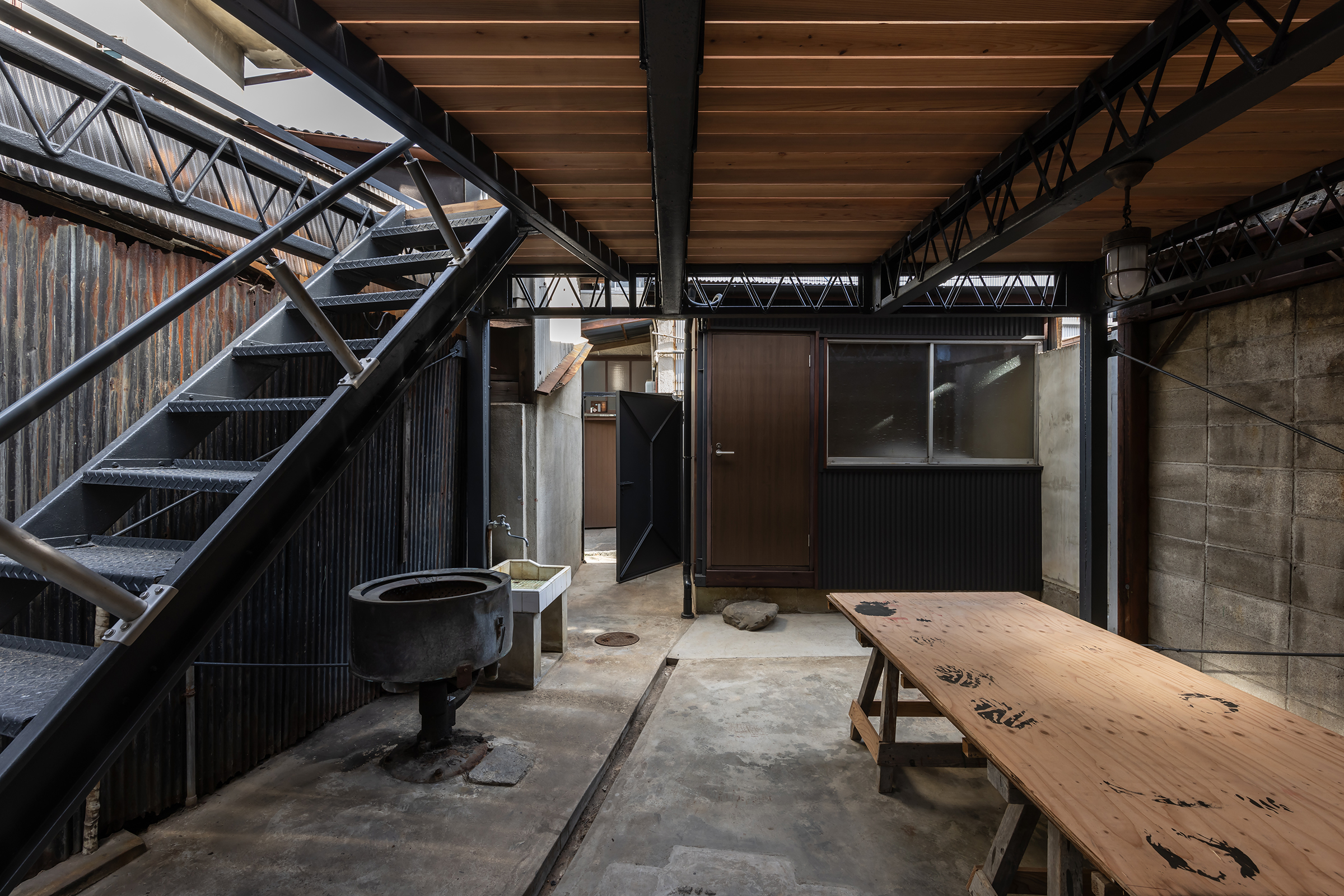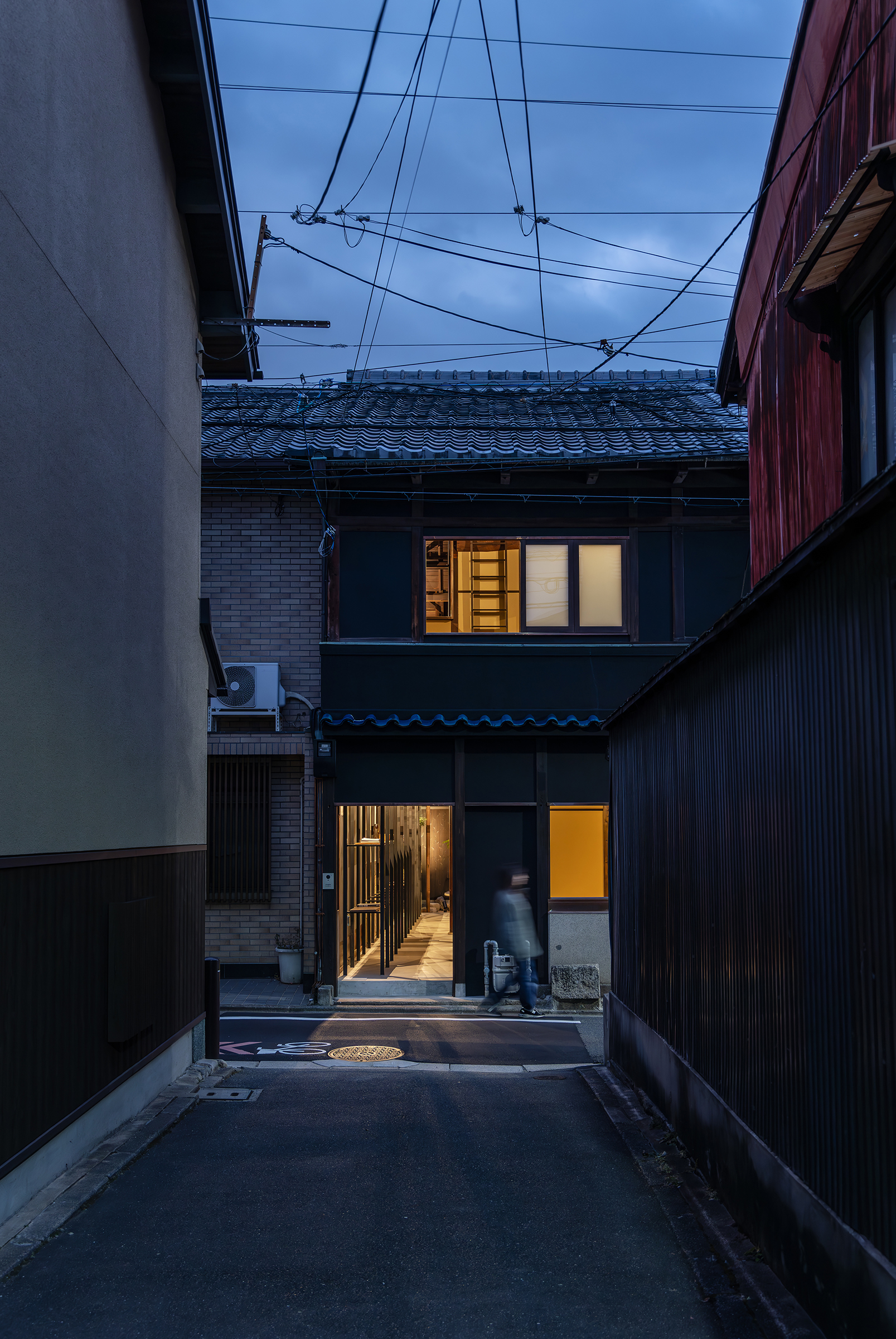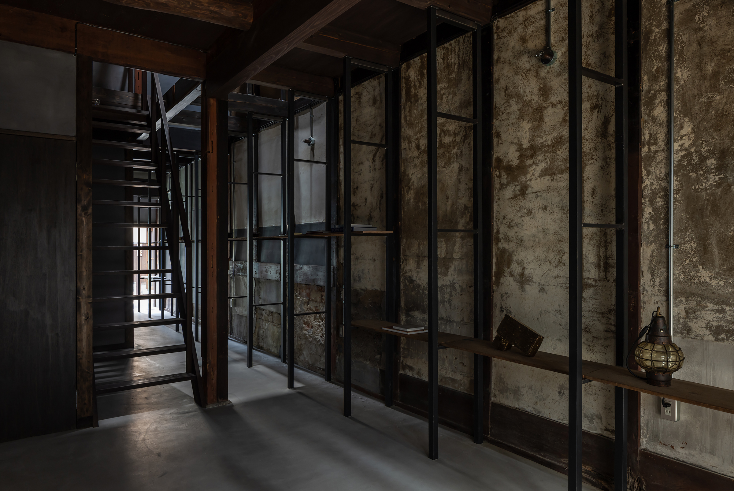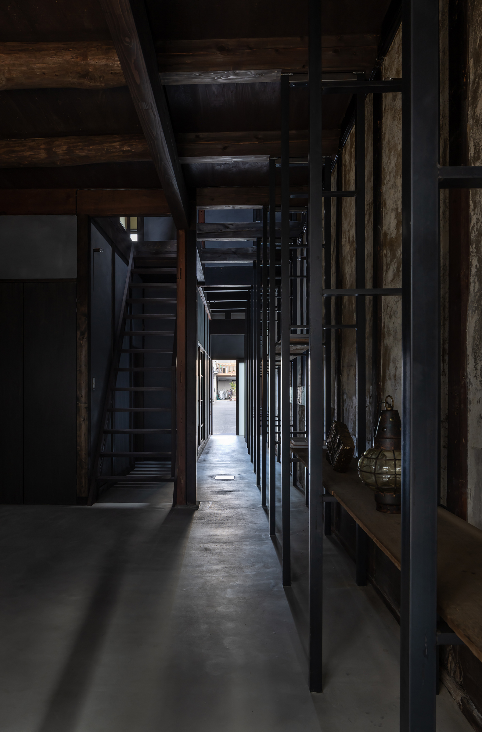 京都市中京区越後町に位置する町家を改修し、海外在住の芸術家の拠点とするためのプロジェクト。敷地は六角通に面しており、堀川通と油小路通の間の多くの路地や小路に囲まれた地区にある。通りにではなく路地に面した家も多いなか、偶然にもこの家の通り庭は六角通り向かいの細い路地の延長線上に位置していた。そこで、この計画では、通り庭を分散していた既存の間仕切り壁を撤去し北側の通りから奥庭までの動線を一直線に繋ぎ、光と風が抜ける通り土間とした。奥の庭は作業場へと続き、東隣の路地と鉄扉で繋がる。これらの周辺環境のみちの空間体験を建築内部にも引き込むことで「町」と「家」の境界のようなものを取り除こうと考えた。 「町」の中に「家」があるのではなく、「家」の中でも「町」の存在や空気を感じることができるようなことを意識した。通り庭沿いに設けられた鉄製の梯子状フレームは、間仕切り壁を撤去した既存の木造に対しての水平耐力を補う柔らかい構造補強として屋根まで達している。 この梯子状フレームに既存の床板などの古材を自由に配置することで違い棚として使うことを提案した。棚として使ったり、町から探してきたものをここに置き飾ったり、日々の生活が滲み出ることで周辺のみちと一続きとなった路地奥のような「町」と「家」が混じりあった空間となることを願っている。