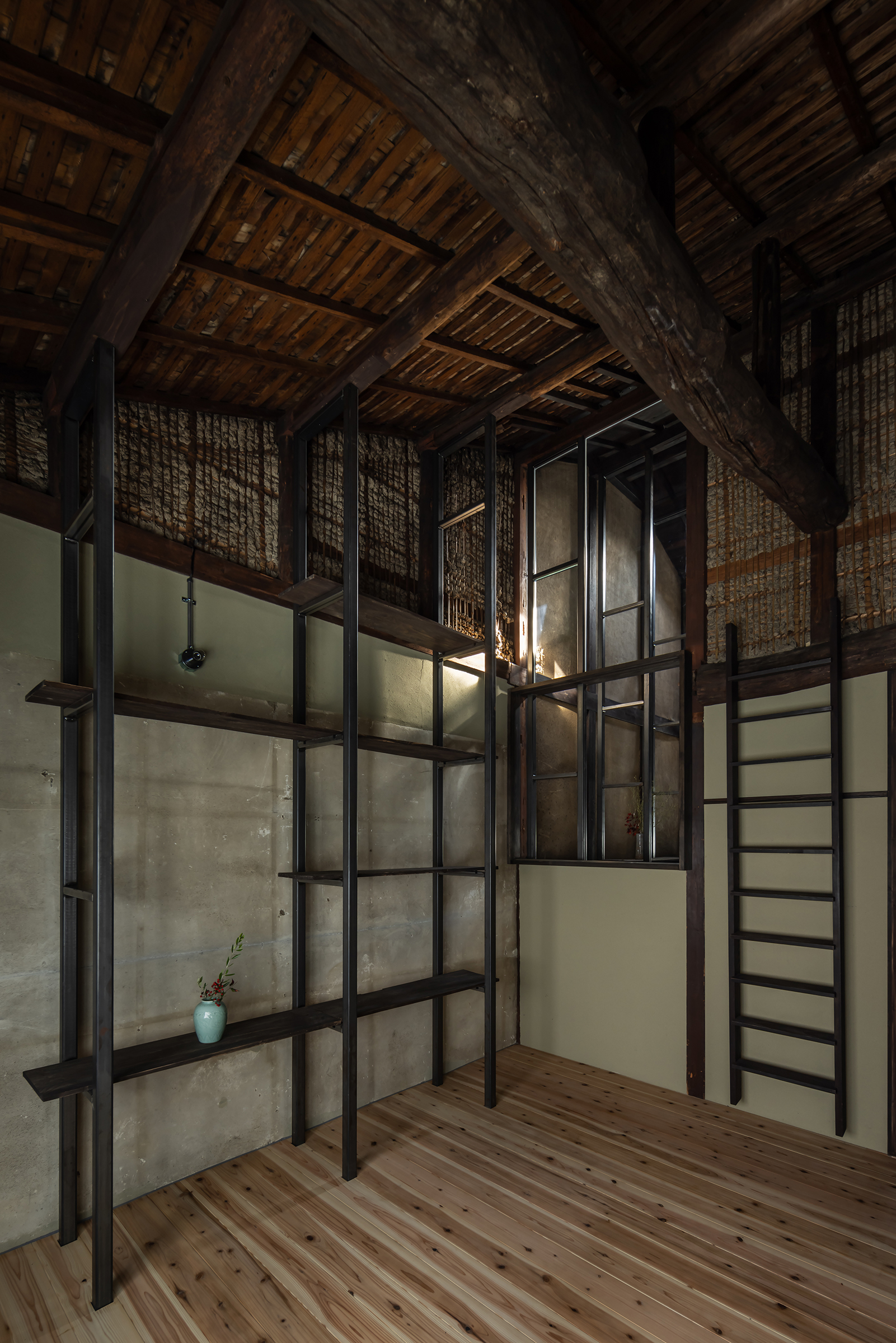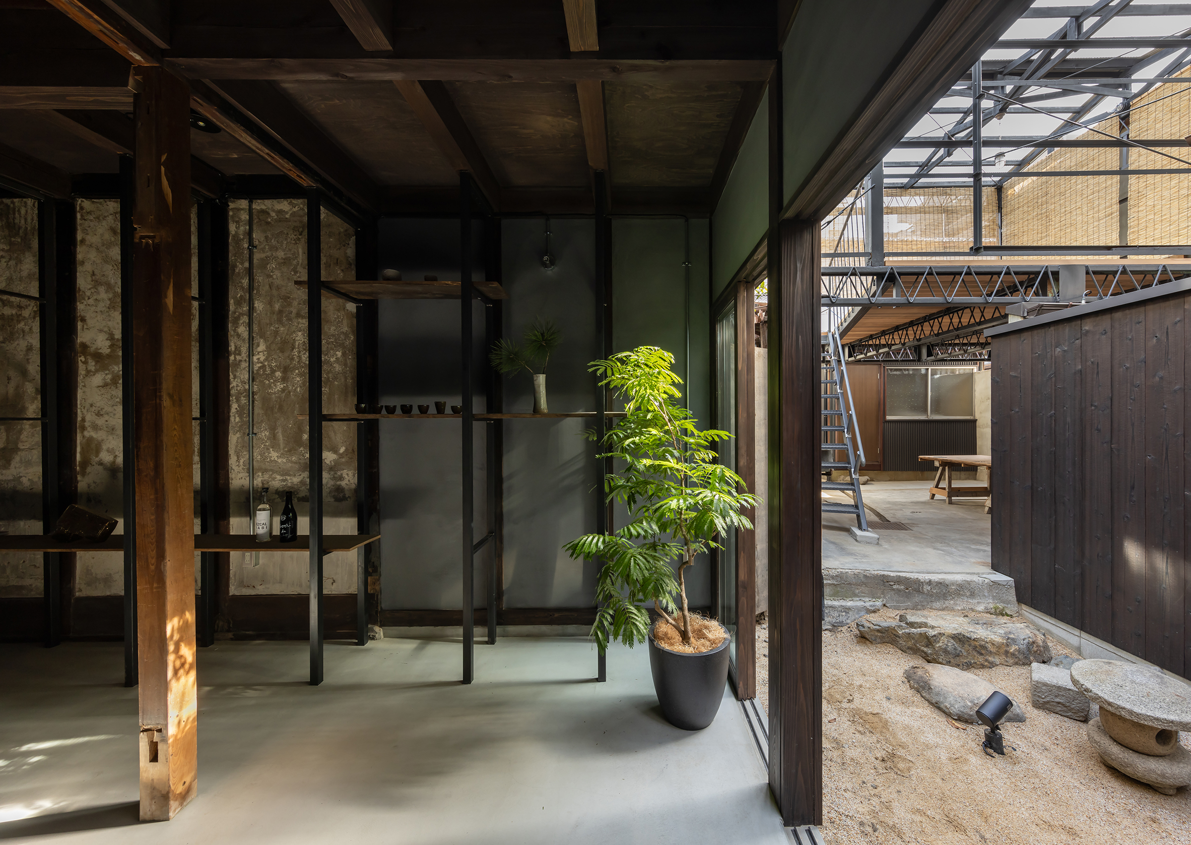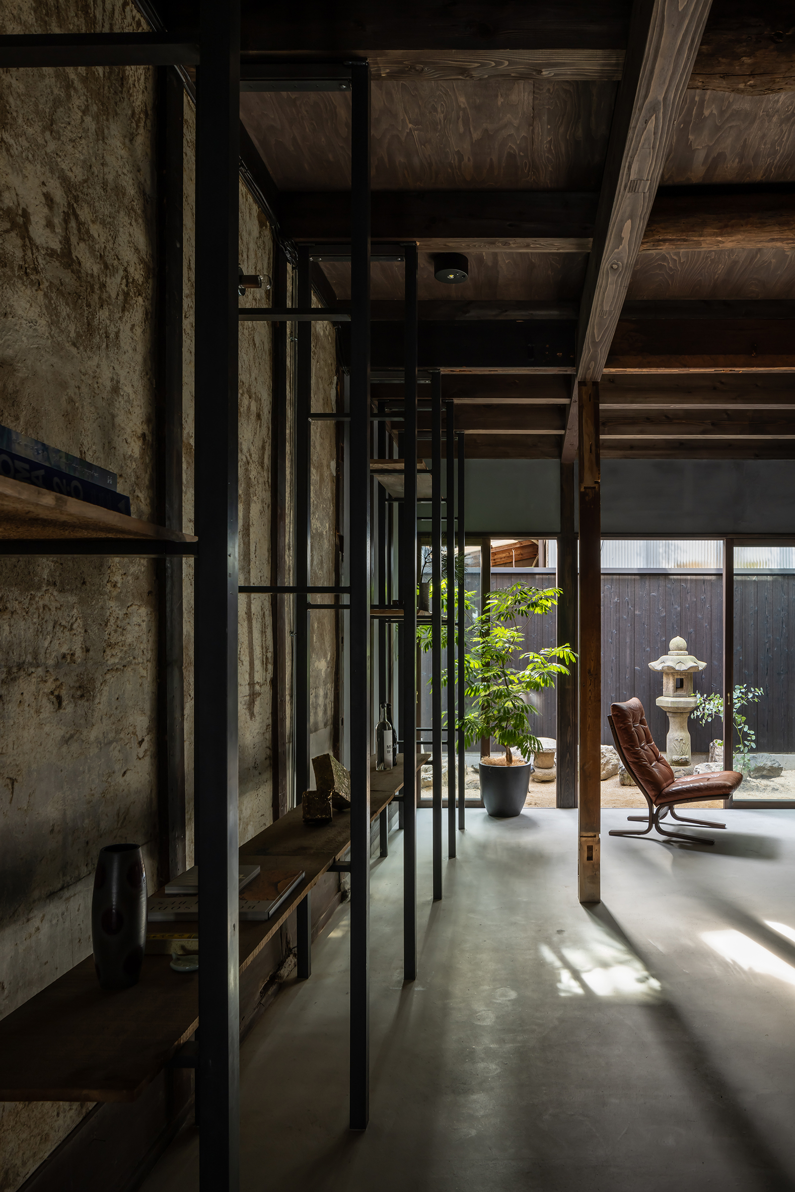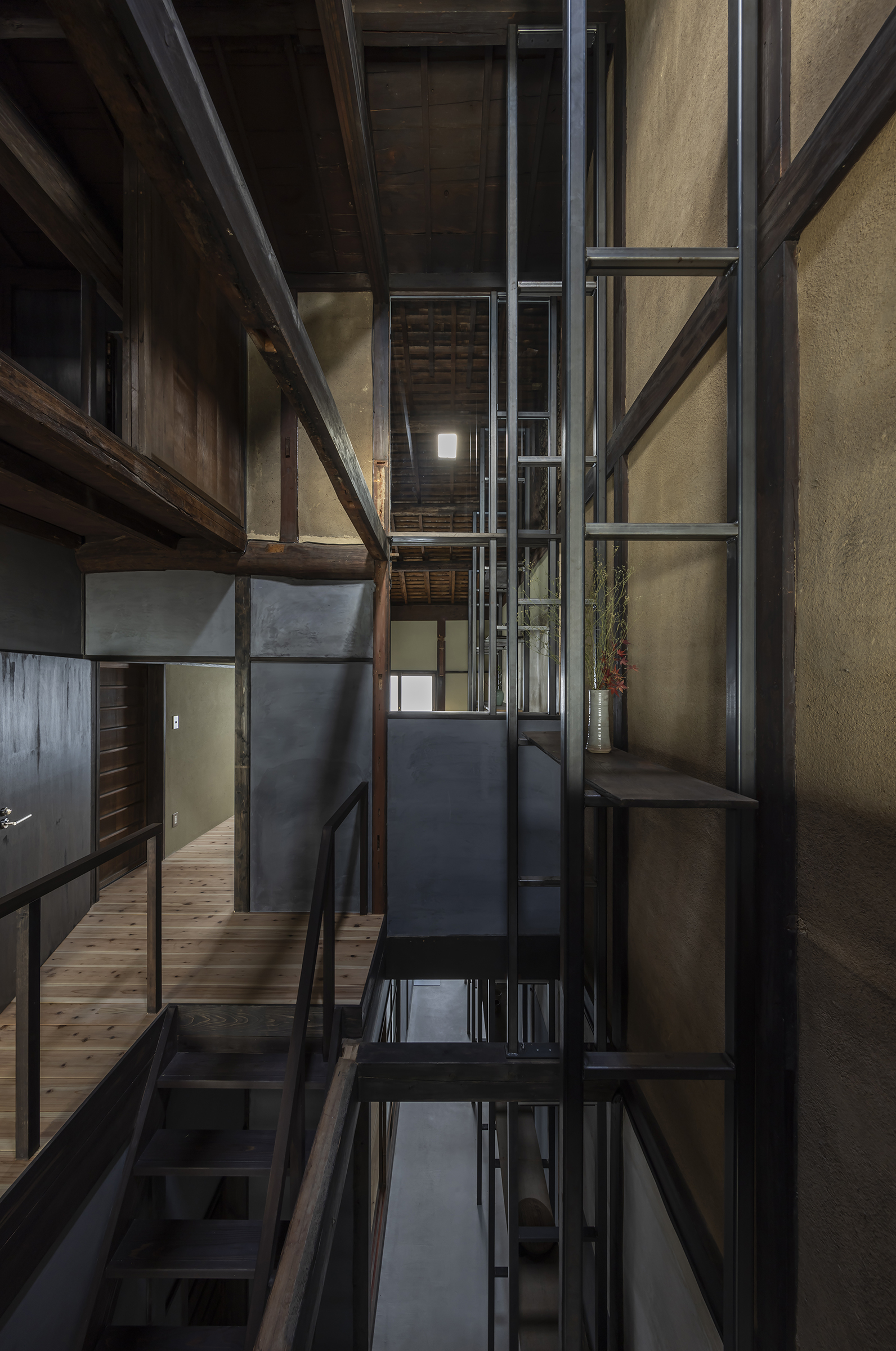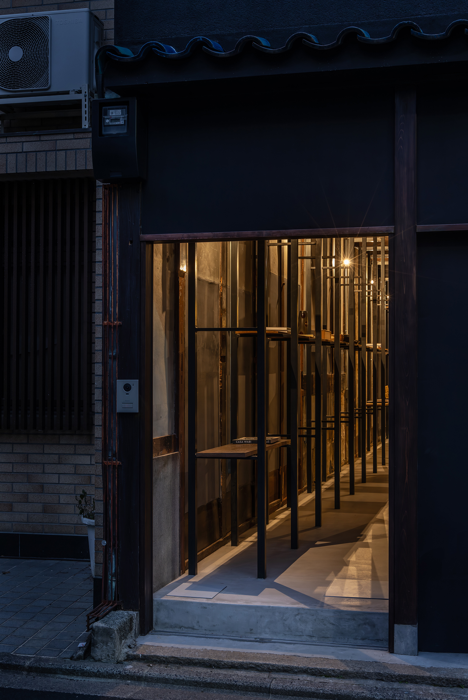 京都市中京区越後町に位置する町家を改修し、海外在住の芸術家の拠点とするためのプロジェクト。敷地は六角通に面しており、堀川通と油小路通の間の多くの路地や小路に囲まれた地区にある。通りにではなく路地に面した家も多いなか、偶然にもこの家の通り庭は六角通り向かいの細い路地の延長線上に位置していた。そこで、この計画では、通り庭を分散していた既存の間仕切り壁を撤去し北側の通りから奥庭までの動線を一直線に繋ぎ、光と風が抜ける通り土間とした。奥の庭は作業場へと続き、東隣の路地と鉄扉で繋がる。これらの周辺環境のみちの空間体験を建築内部にも引き込むことで「町」と「家」の境界のようなものを取り除こうと考えた。 「町」の中に「家」があるのではなく、「家」の中でも「町」の存在や空気を感じることができるようなことを意識した。通り庭沿いに設けられた鉄製の梯子状フレームは、間仕切り壁を撤去した既存の木造に対しての水平耐力を補う柔らかい構造補強として屋根まで達している。 この梯子状フレームに既存の床板などの古材を自由に配置することで違い棚として使うことを提案した。棚として使ったり、町から探してきたものをここに置き飾ったり、日々の生活が滲み出ることで周辺のみちと一続きとなった路地奥のような「町」と「家」が混じりあった空間となることを願っている。
