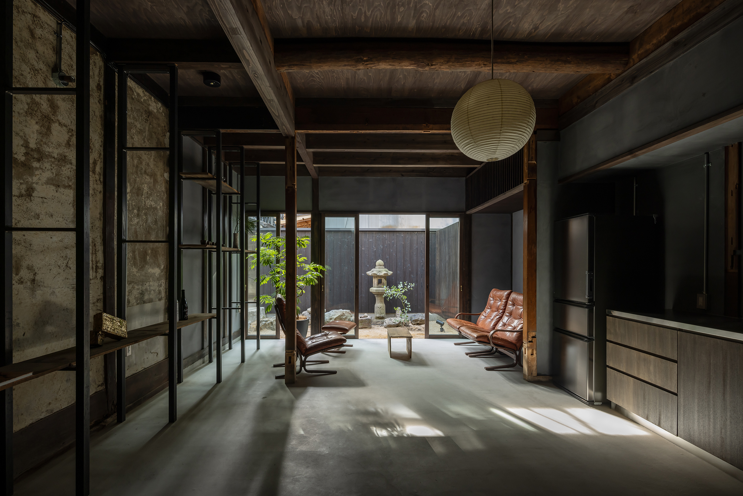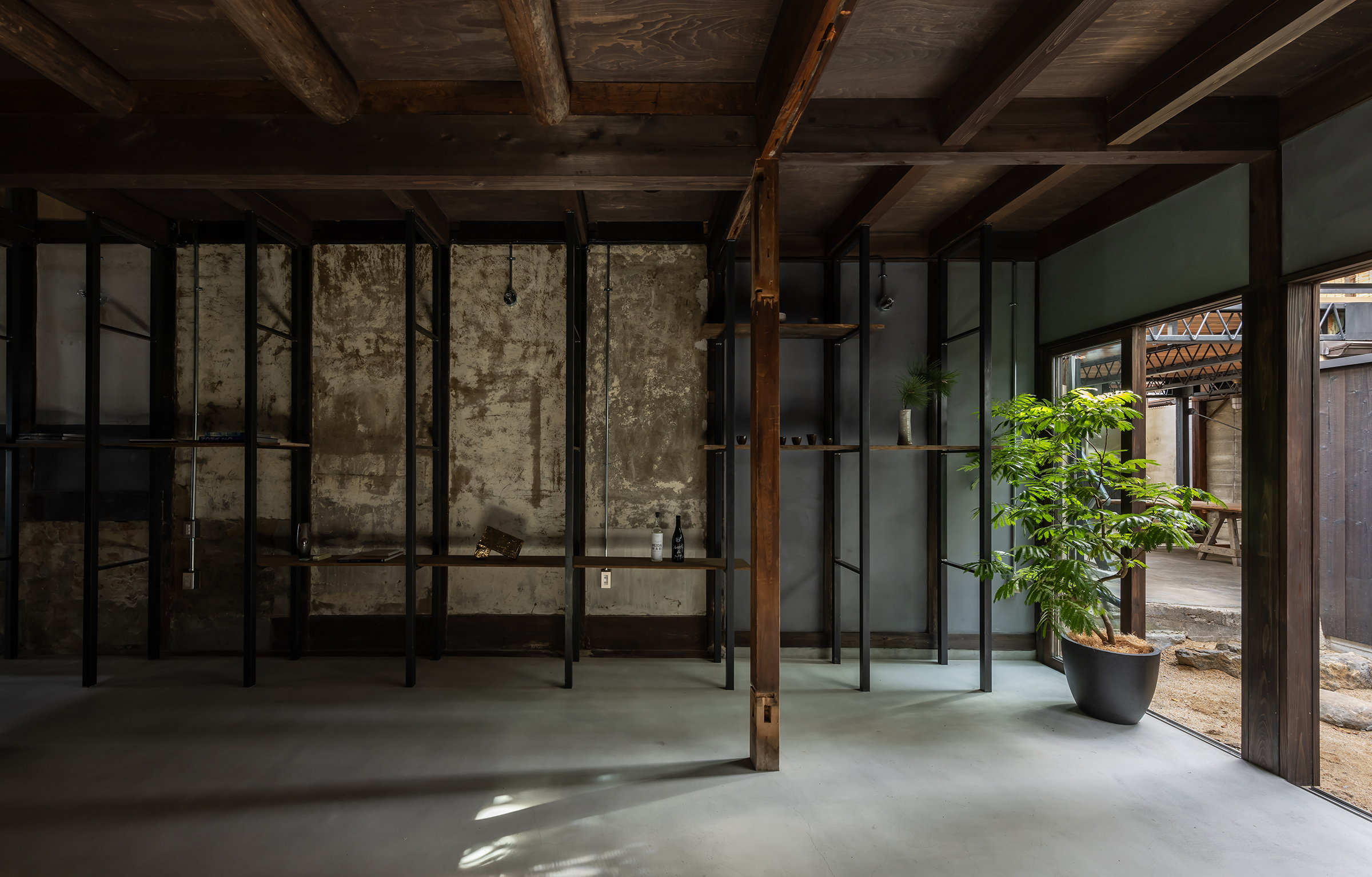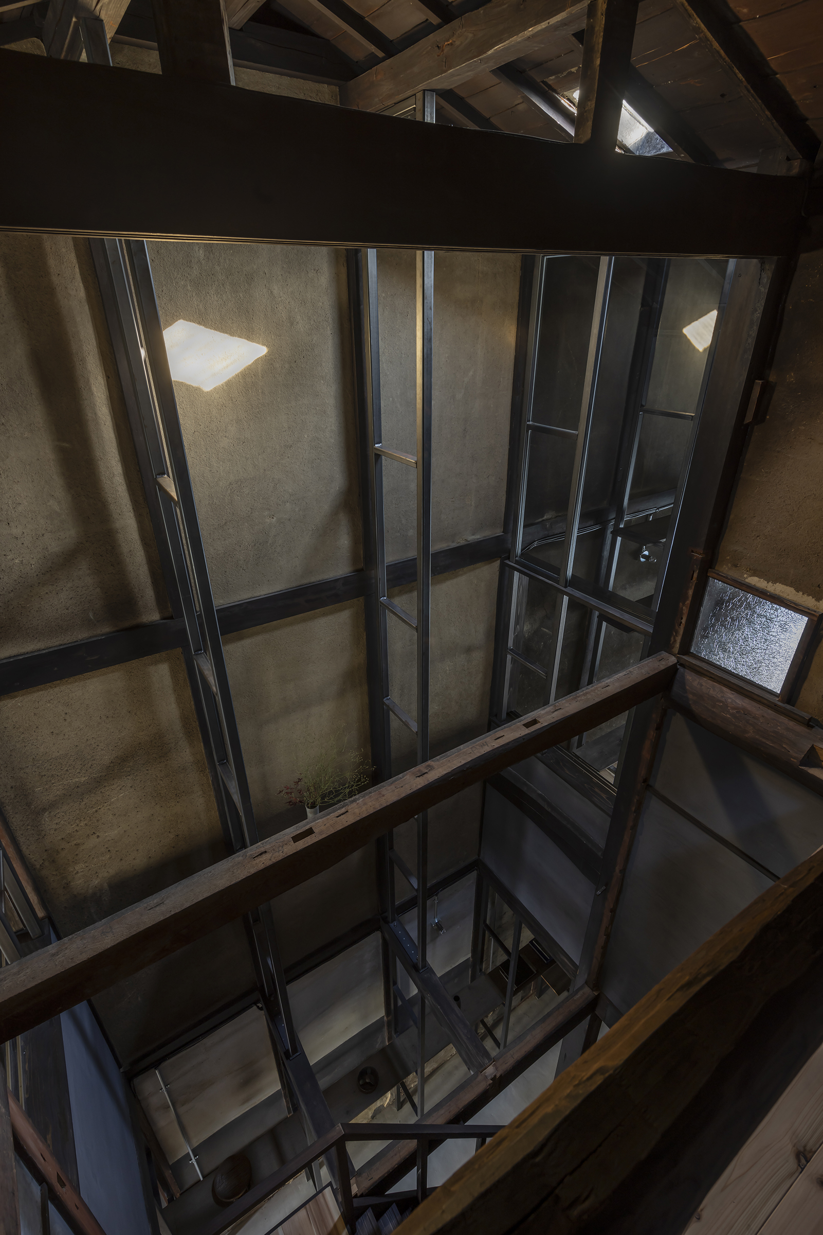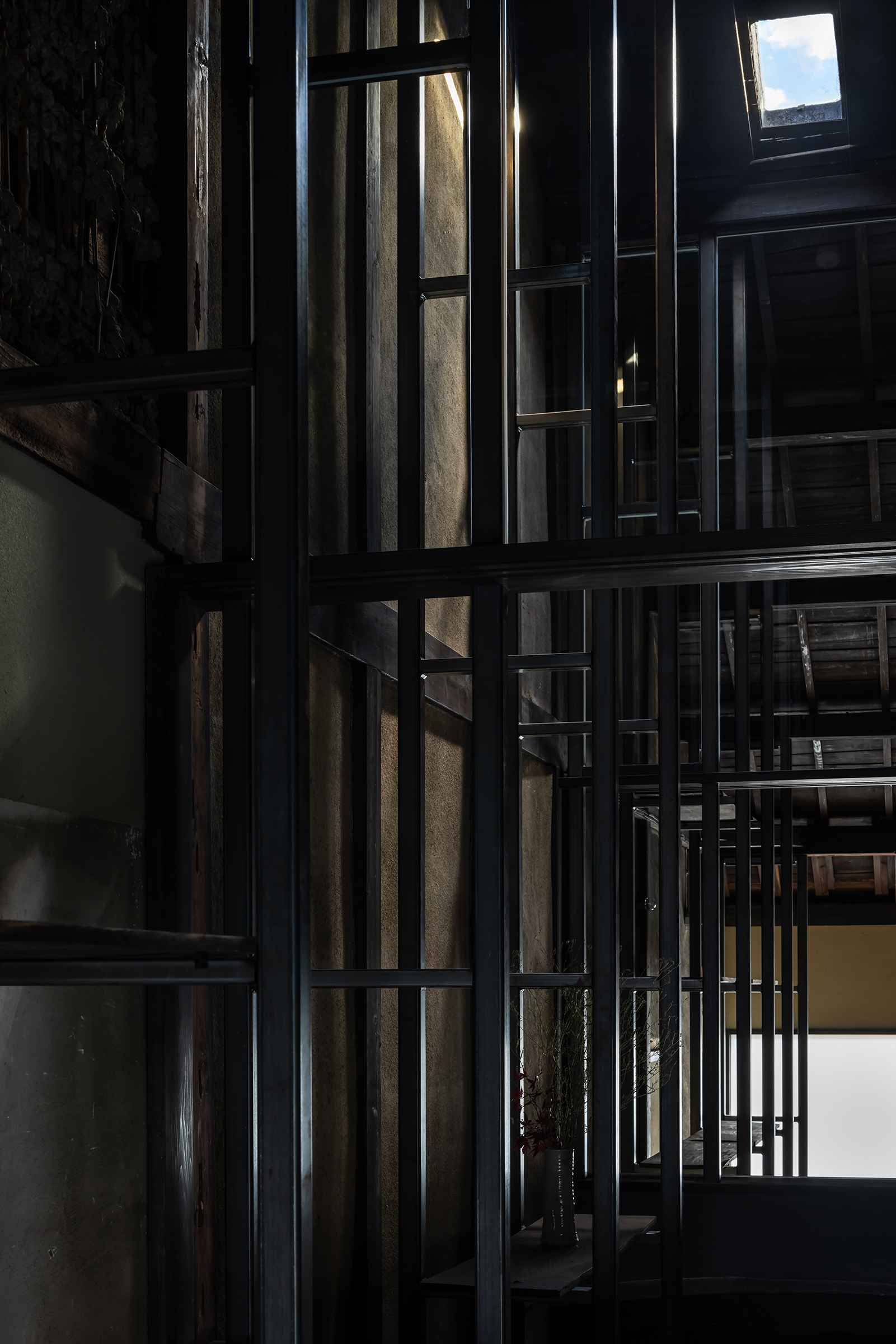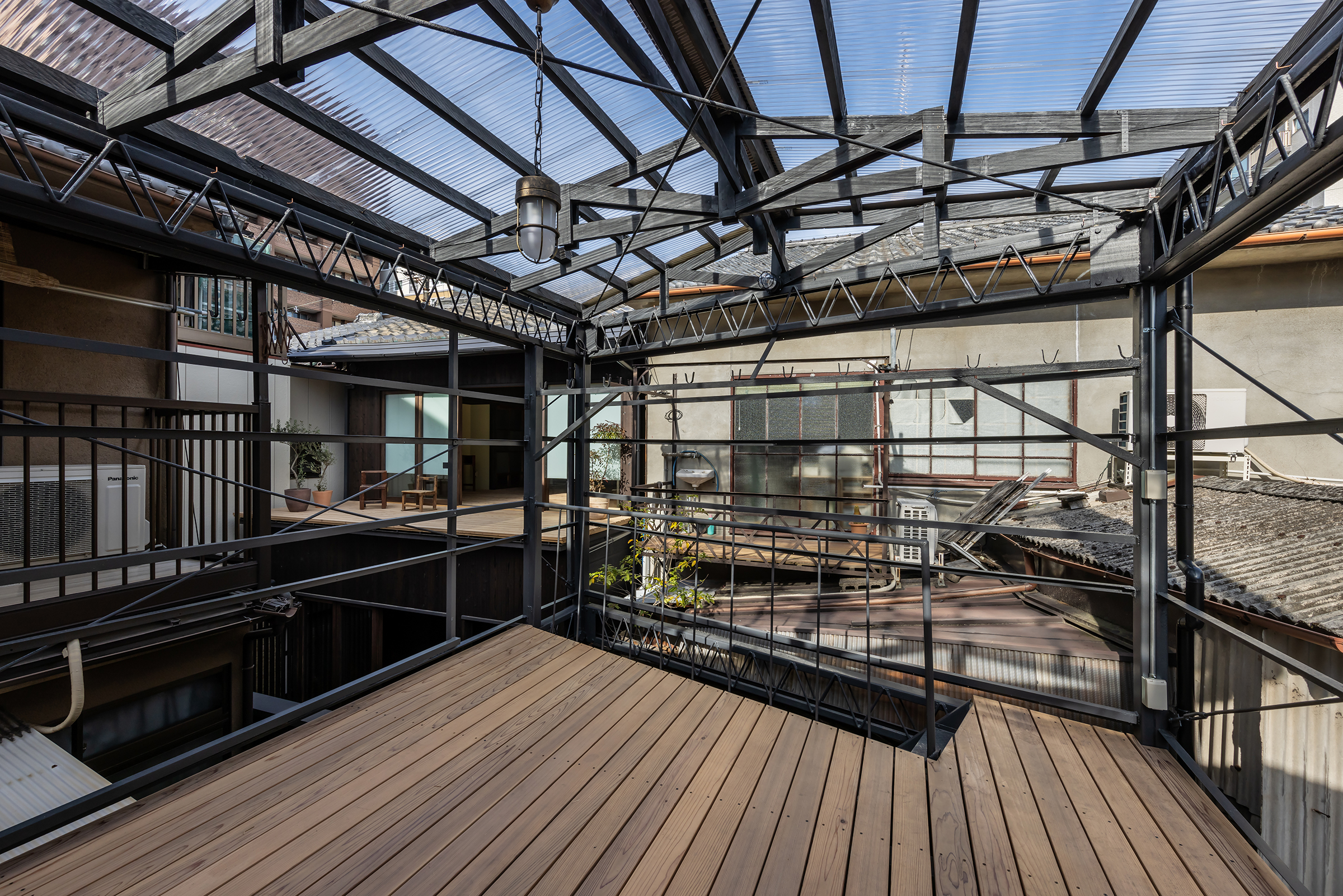 京都市中京区越後町に位置する町家を改修し、海外在住の芸術家の拠点とするためのプロジェクト。敷地は六角通に面しており、堀川通と油小路通の間の多くの路地や小路に囲まれた地区にある。通りにではなく路地に面した家も多いなか、偶然にもこの家の通り庭は六角通り向かいの細い路地の延長線上に位置していた。そこで、この計画では、通り庭を分散していた既存の間仕切り壁を撤去し北側の通りから奥庭までの動線を一直線に繋ぎ、光と風が抜ける通り土間とした。奥の庭は作業場へと続き、東隣の路地と鉄扉で繋がる。これらの周辺環境のみちの空間体験を建築内部にも引き込むことで「町」と「家」の境界のようなものを取り除こうと考えた。 「町」の中に「家」があるのではなく、「家」の中でも「町」の存在や空気を感じることができるようなことを意識した。通り庭沿いに設けられた鉄製の梯子状フレームは、間仕切り壁を撤去した既存の木造に対しての水平耐力を補う柔らかい構造補強として屋根まで達している。 この梯子状フレームに既存の床板などの古材を自由に配置することで違い棚として使うことを提案した。棚として使ったり、町から探してきたものをここに置き飾ったり、日々の生活が滲み出ることで周辺のみちと一続きとなった路地奥のような「町」と「家」が混じりあった空間となることを願っている。