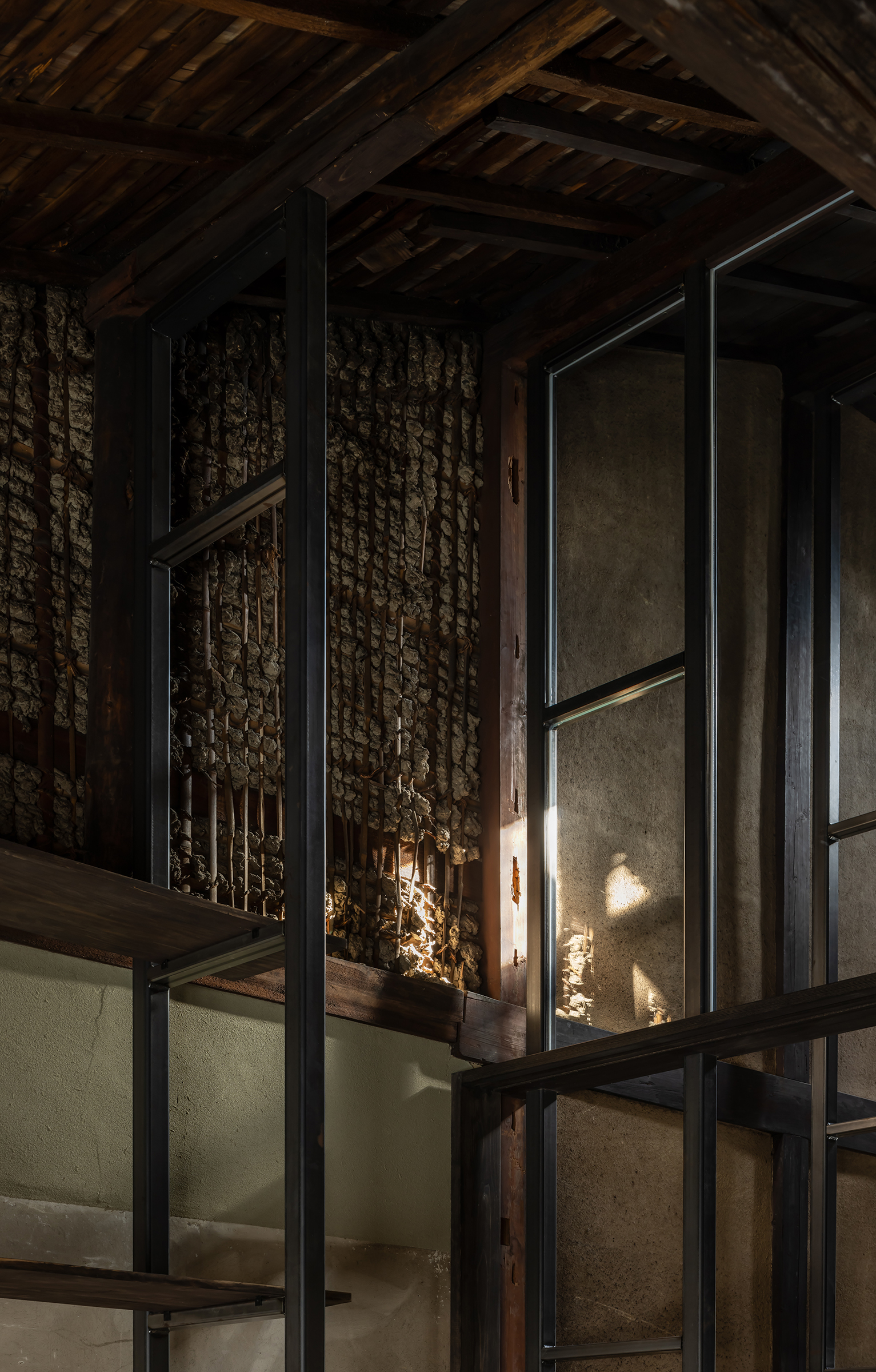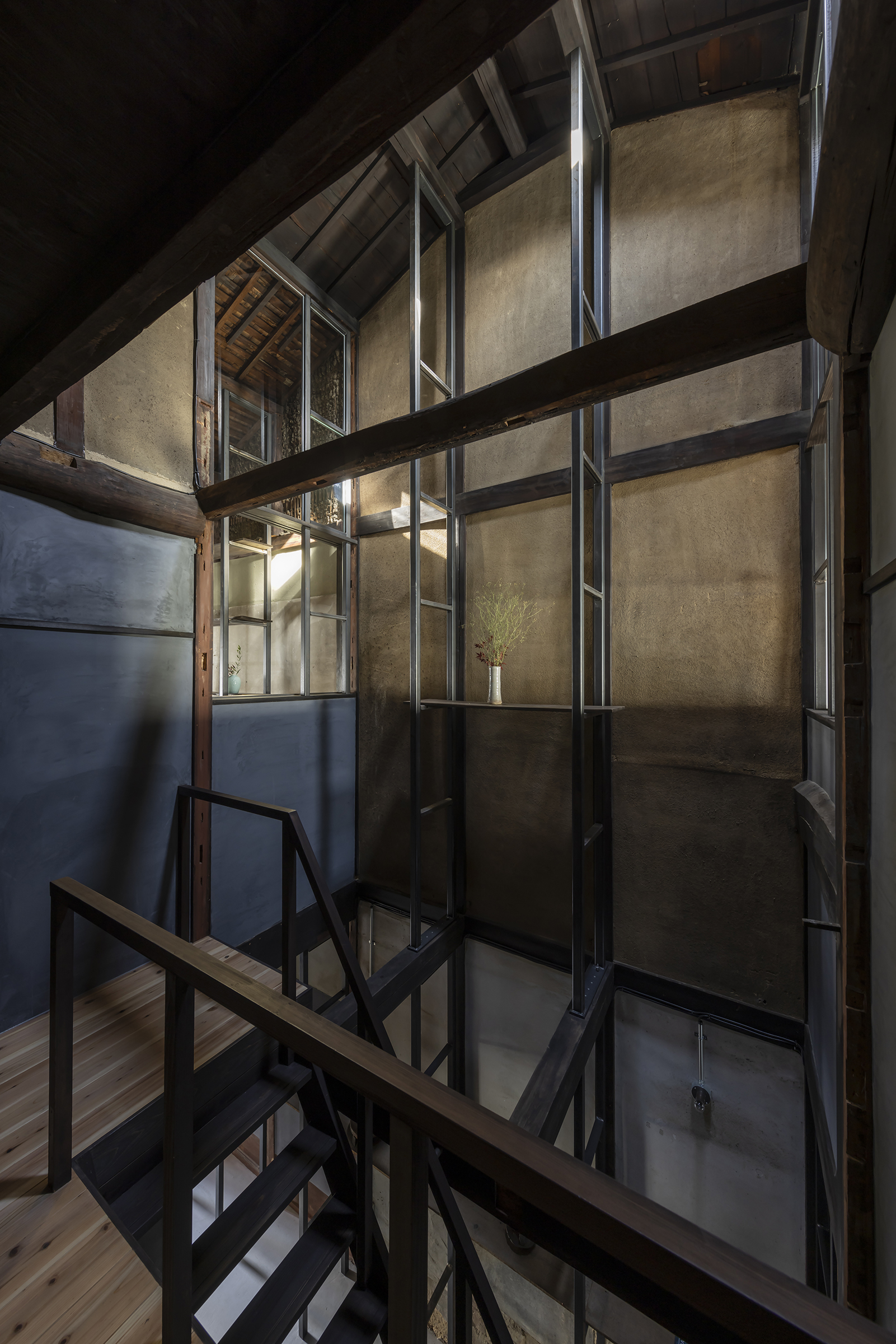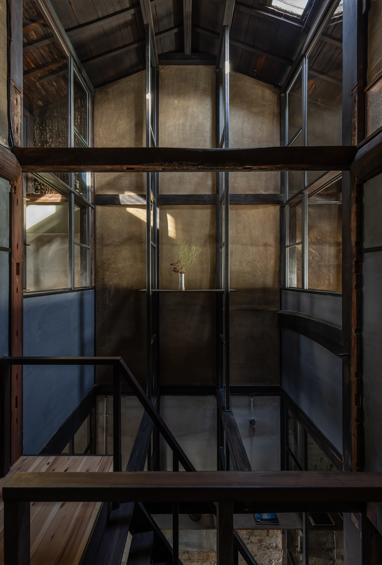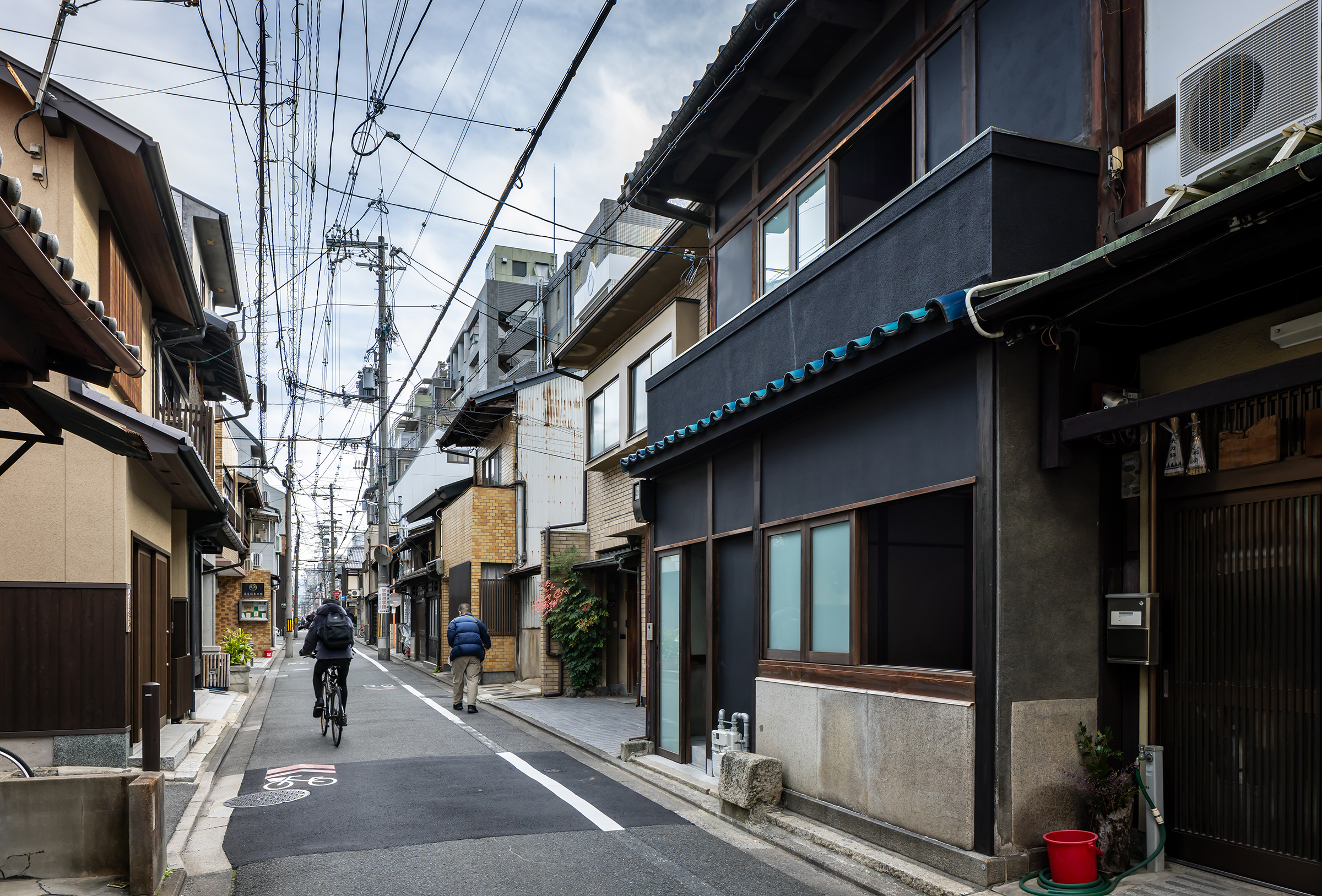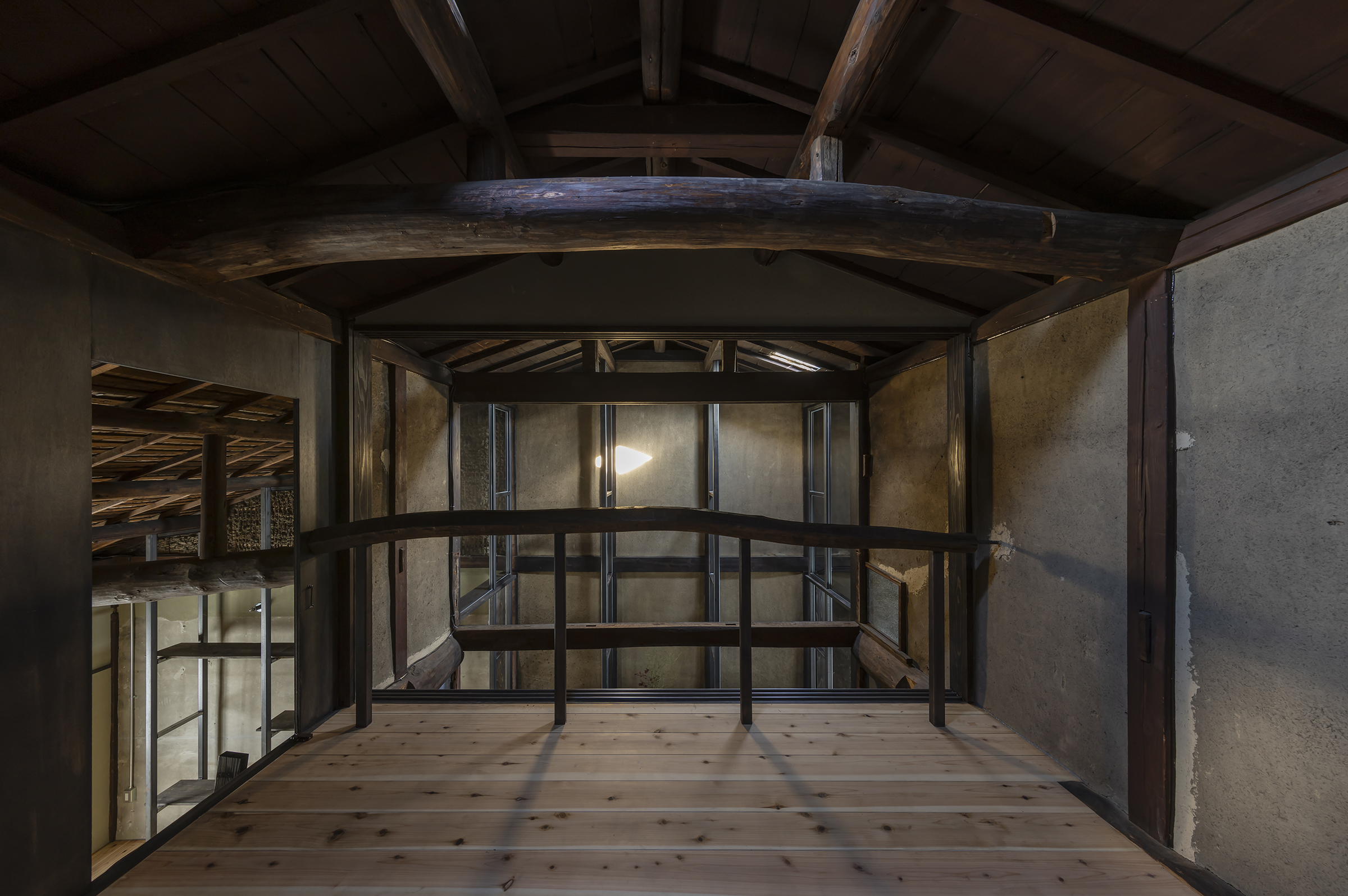 京都市中京区越後町に位置する町家を改修し、海外在住の芸術家の拠点とするためのプロジェクト。敷地は六角通に面しており、堀川通と油小路通の間の多くの路地や小路に囲まれた地区にある。通りにではなく路地に面した家も多いなか、偶然にもこの家の通り庭は六角通り向かいの細い路地の延長線上に位置していた。そこで、この計画では、通り庭を分散していた既存の間仕切り壁を撤去し北側の通りから奥庭までの動線を一直線に繋ぎ、光と風が抜ける通り土間とした。奥の庭は作業場へと続き、東隣の路地と鉄扉で繋がる。これらの周辺環境のみちの空間体験を建築内部にも引き込むことで「町」と「家」の境界のようなものを取り除こうと考えた。 「町」の中に「家」があるのではなく、「家」の中でも「町」の存在や空気を感じることができるようなことを意識した。通り庭沿いに設けられた鉄製の梯子状フレームは、間仕切り壁を撤去した既存の木造に対しての水平耐力を補う柔らかい構造補強として屋根まで達している。 この梯子状フレームに既存の床板などの古材を自由に配置することで違い棚として使うことを提案した。棚として使ったり、町から探してきたものをここに置き飾ったり、日々の生活が滲み出ることで周辺のみちと一続きとなった路地奥のような「町」と「家」が混じりあった空間となることを願っている。
