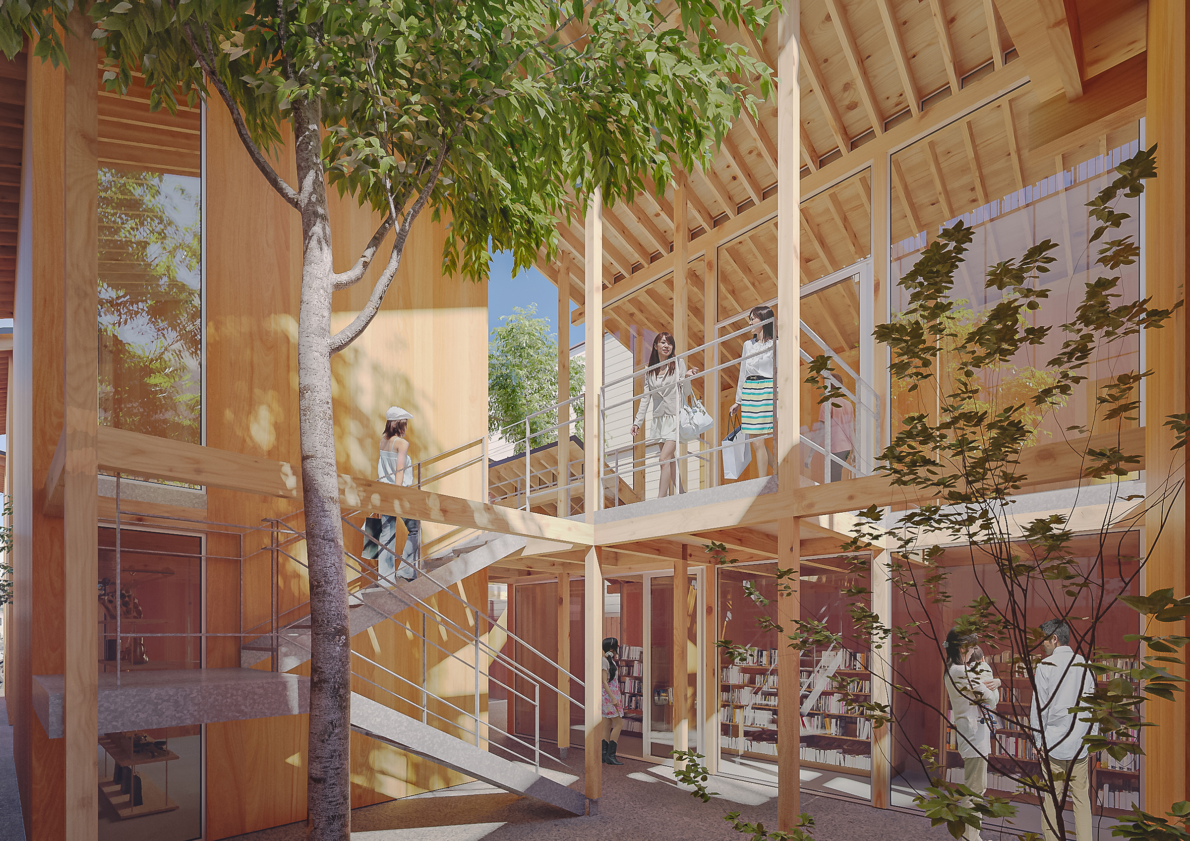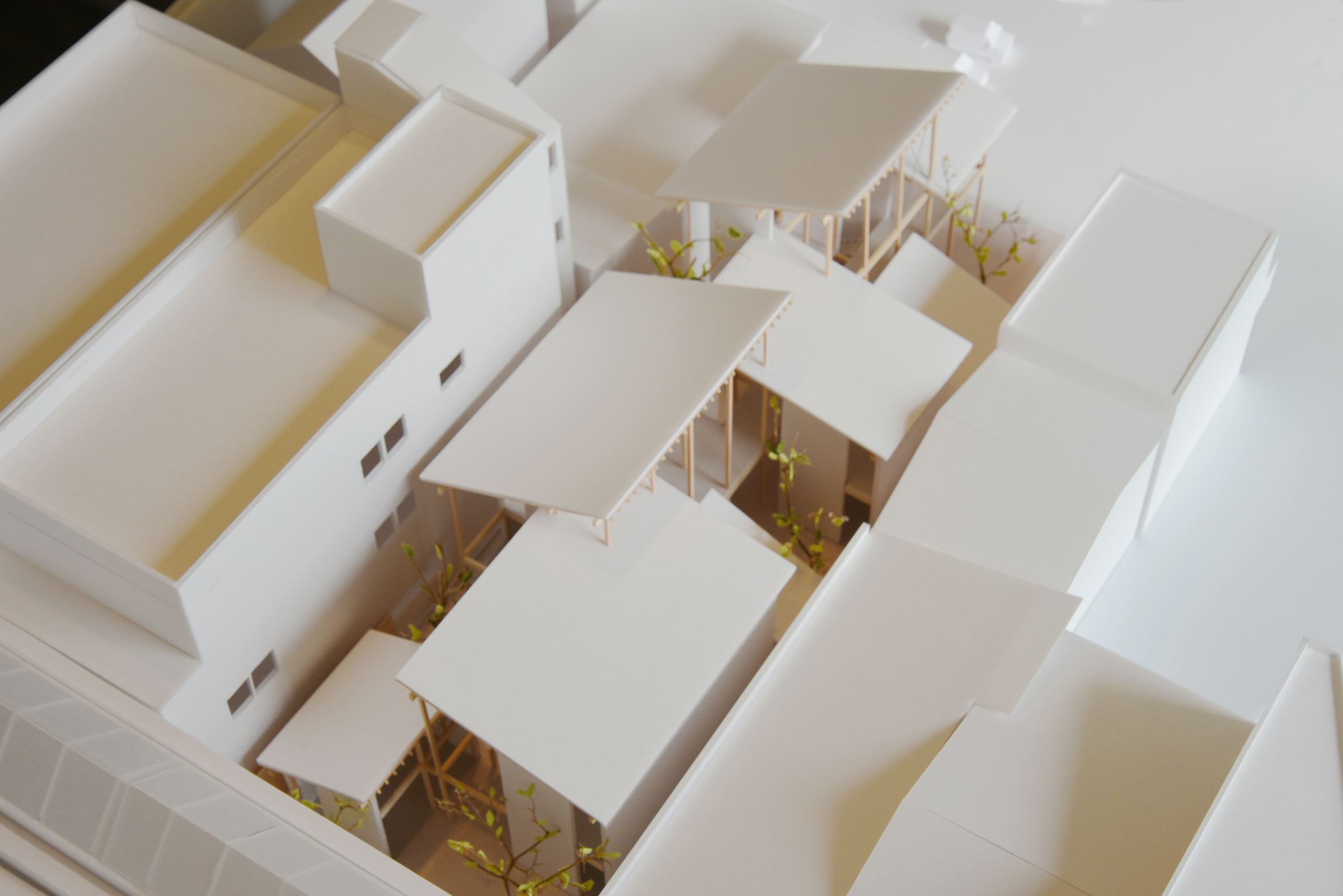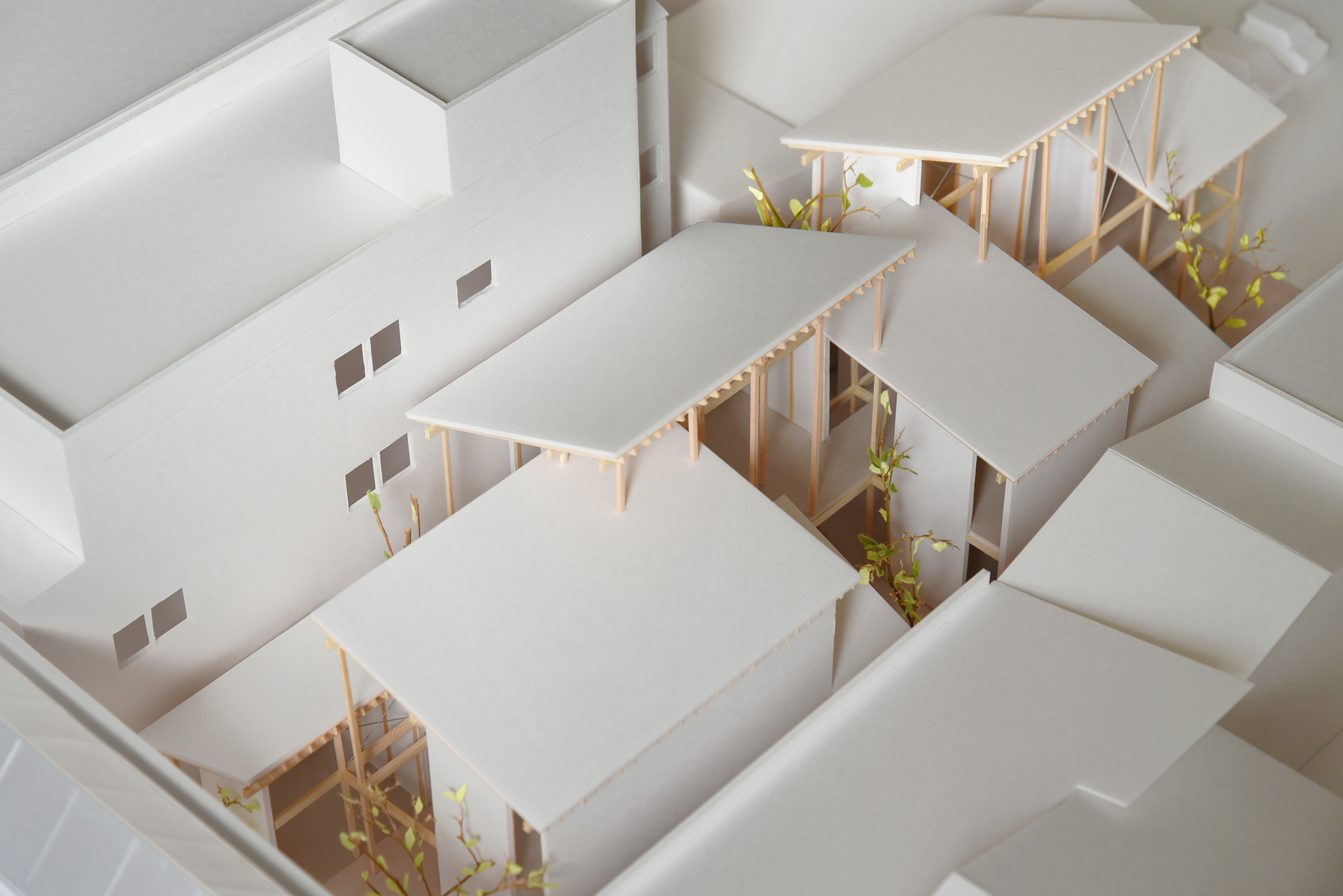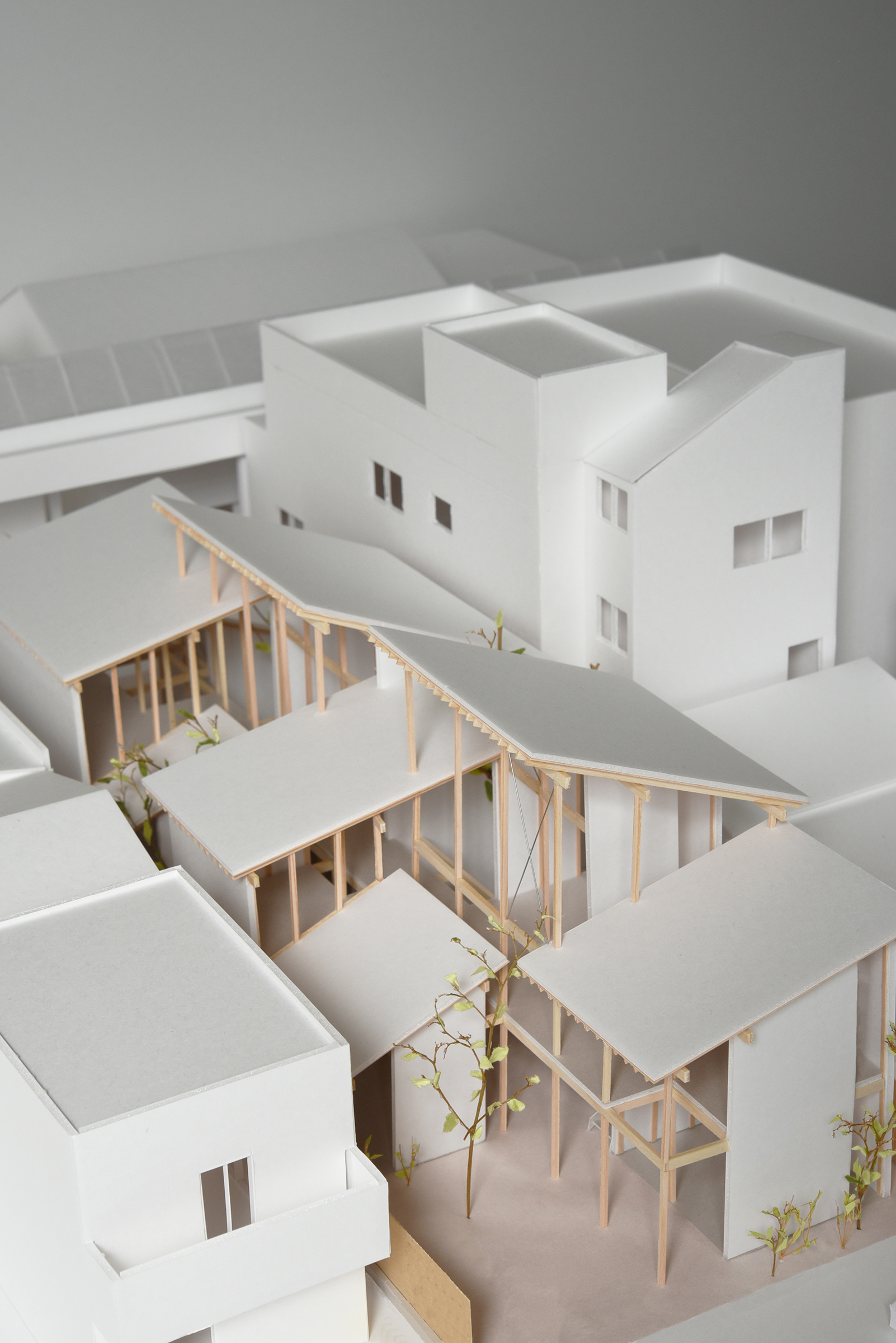 奈良の餅飯殿商店街に小さなスタートアップの店舗の集合体をつくる計画。商店街の南北の軸と、春日山から流れる暗渠となった率川の東西の軸が交差する敷地に、かつての川辺のような賑わいのある遊歩道の空間を計画した。構造的に繋がりながらも内部空間としては独立した店舗に挟まれた中庭を巡りながら2 階の空中回廊まで導かれるような回遊性を提案した。
