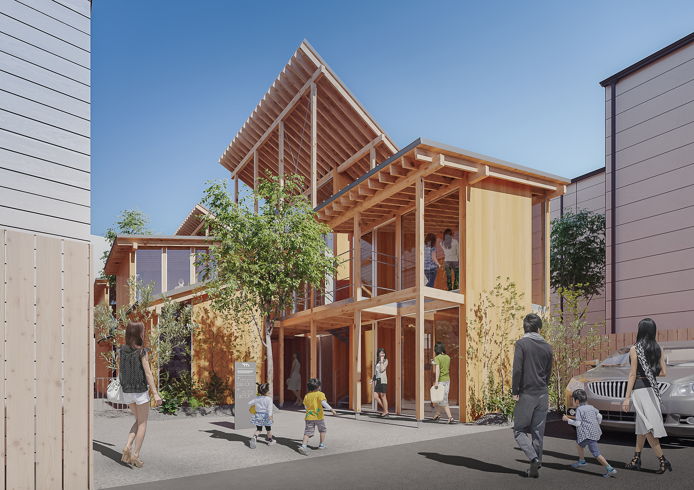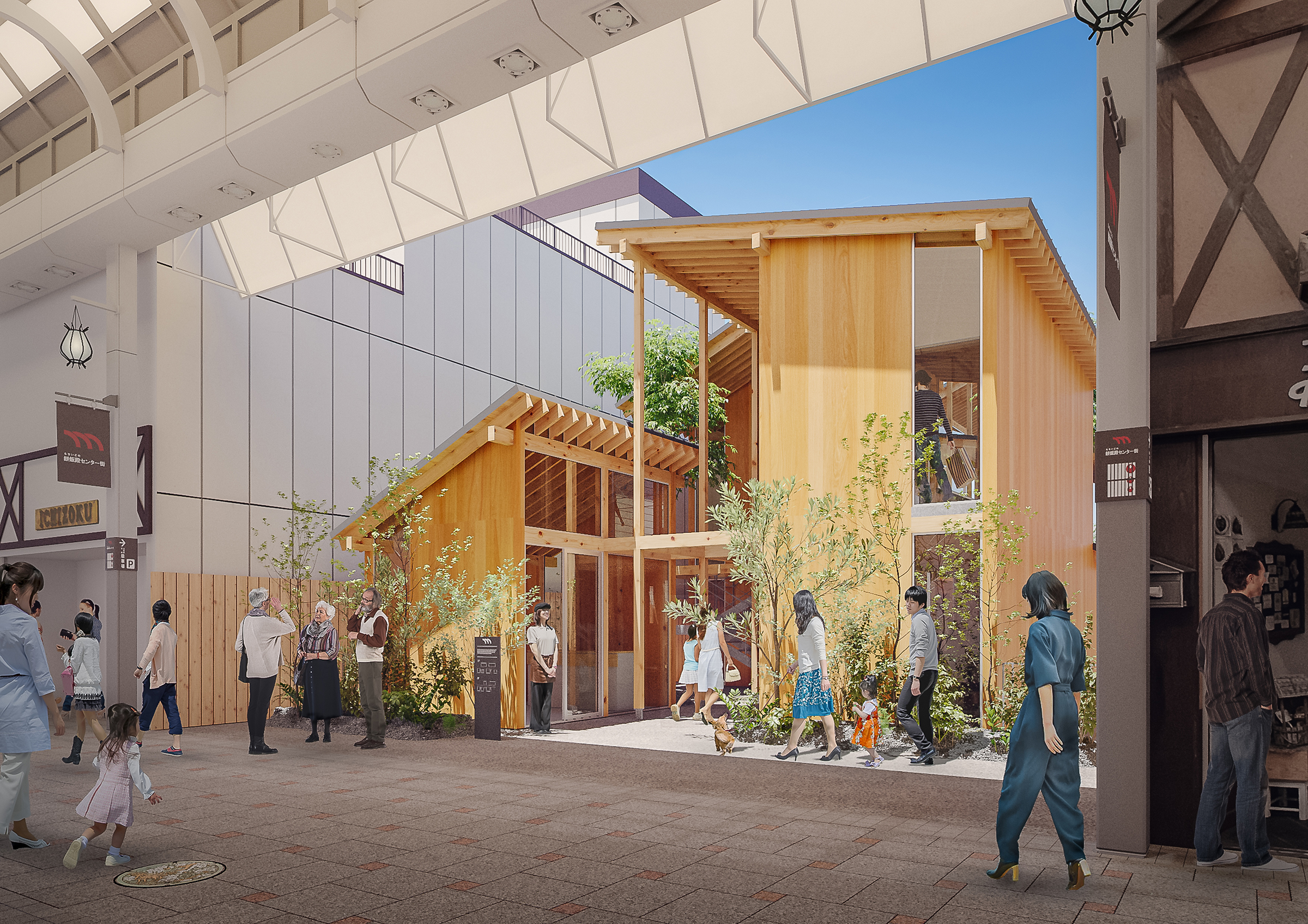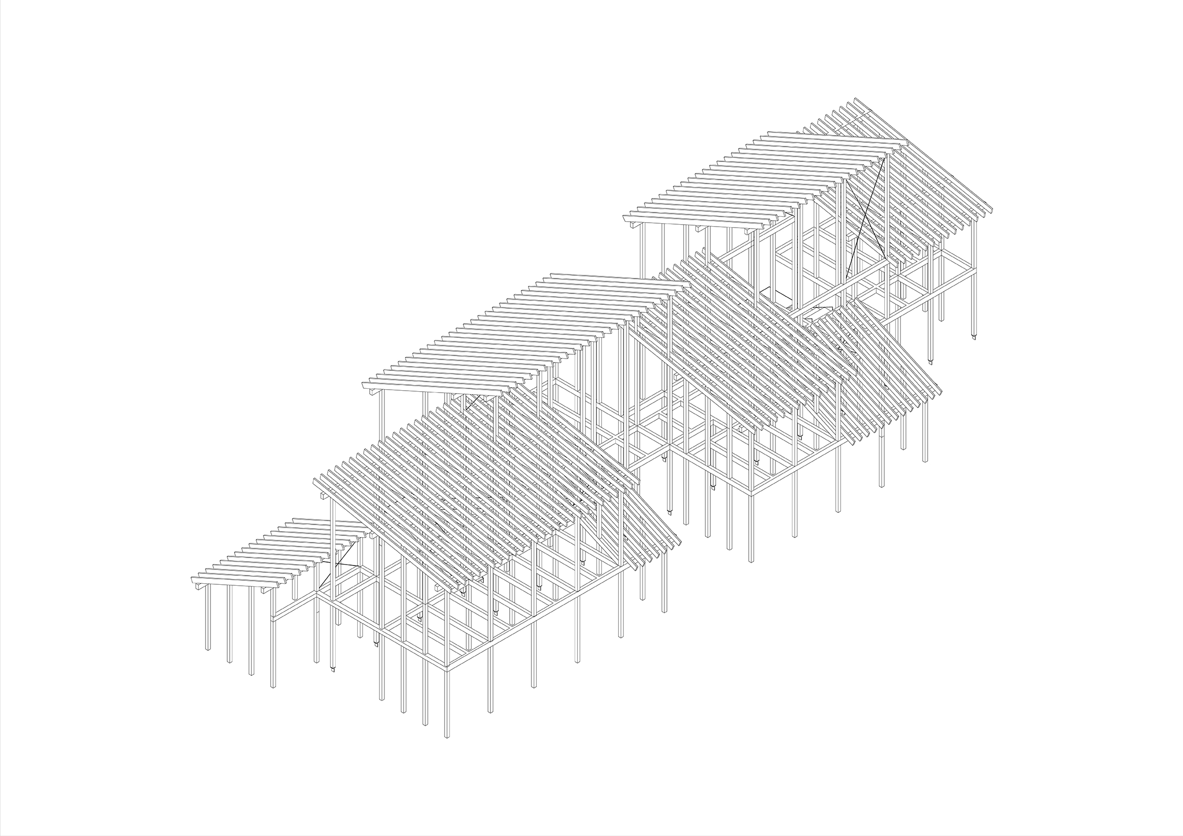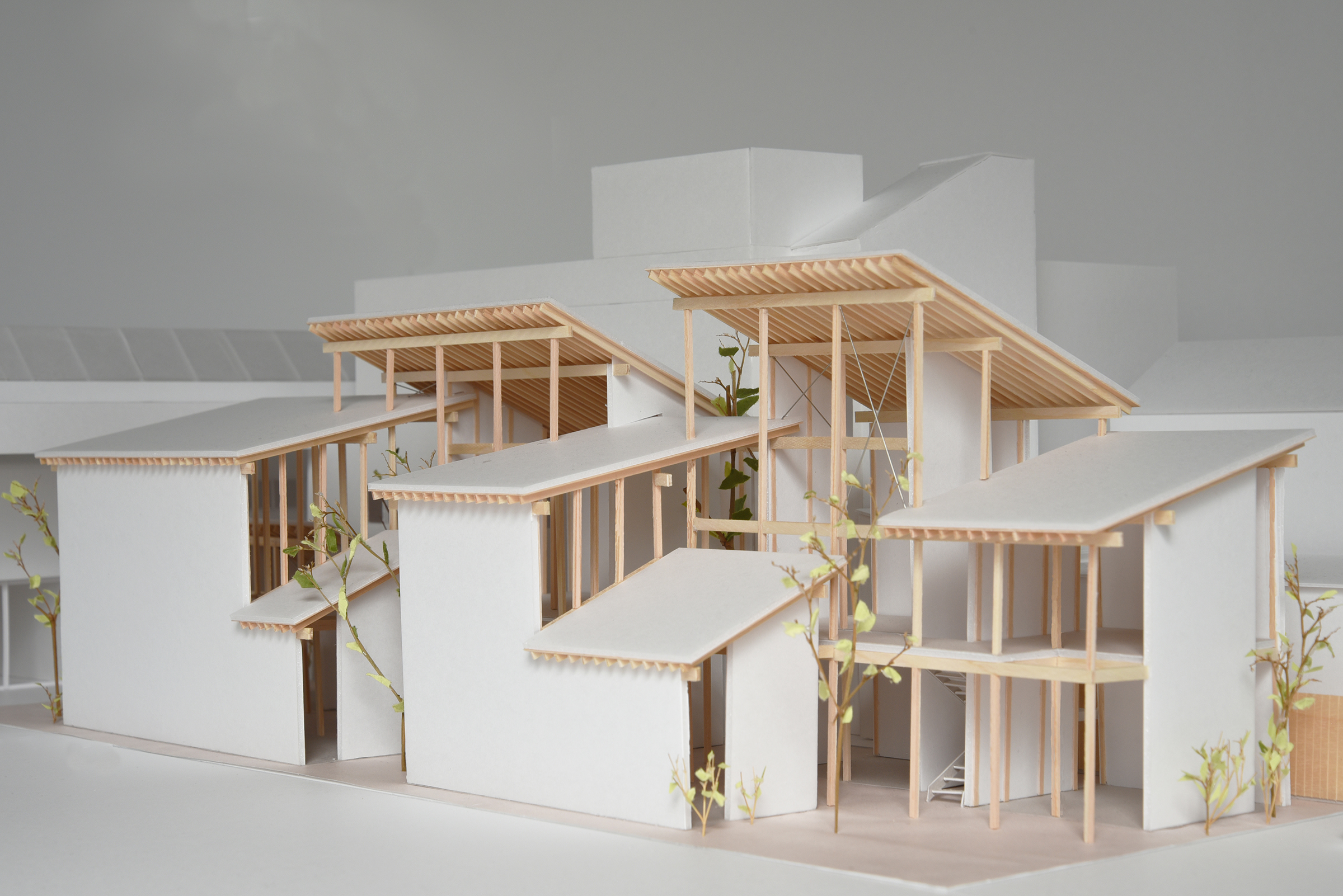 奈良の餅飯殿商店街に小さなスタートアップの店舗の集合体をつくる計画。商店街の南北の軸と、春日山から流れる暗渠となった率川の東西の軸が交差する敷地に、かつての川辺のような賑わいのある遊歩道の空間を計画した。構造的に繋がりながらも内部空間としては独立した店舗に挟まれた中庭を巡りながら2 階の空中回廊まで導かれるような回遊性を提案した。